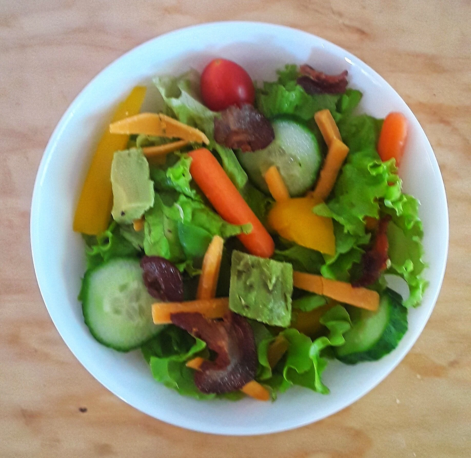Add lettuce to a BIG bowl. Place vegetables, bacon and cheese on top. Toss to combine.